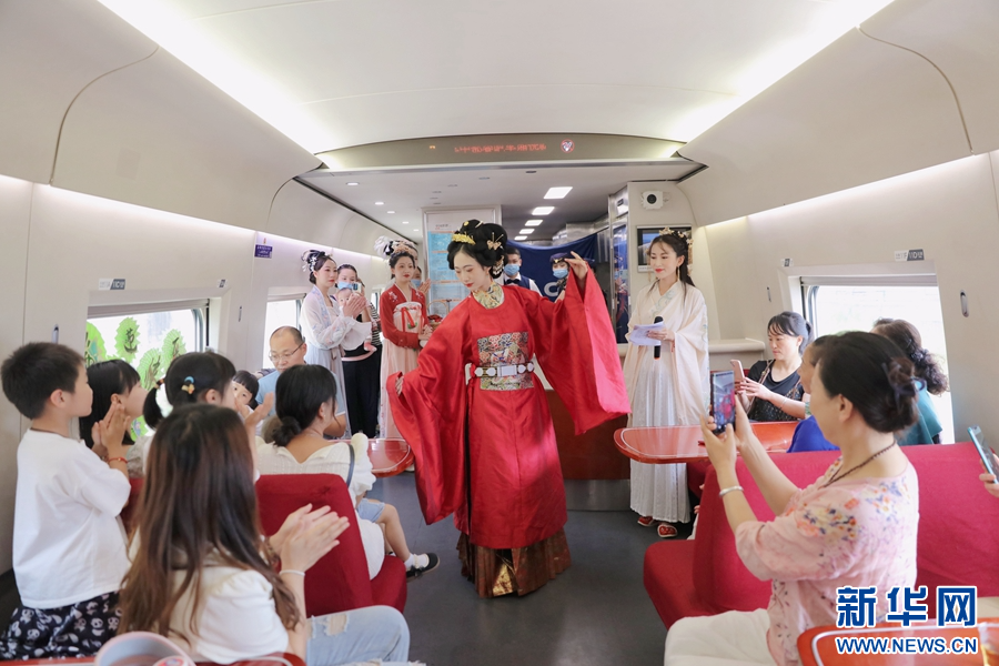 身着汉服的乘务员为旅客带来歌舞表演(摄于6月20日)。新华网发(杨紫轩 摄)