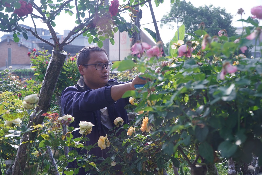 许发佑正在修剪大树月季(资料图)。龙陵县融媒体中心 供图