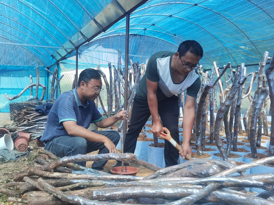 闻涛(左一)和许发佑(右一)正在扦插大树月季(资料图)。龙陵县融媒体中心 供图