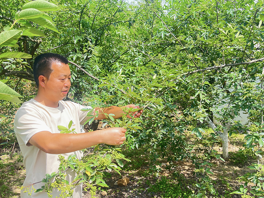 周坤金在花椒林查看椒粒长势(资料图)。李江雪 摄