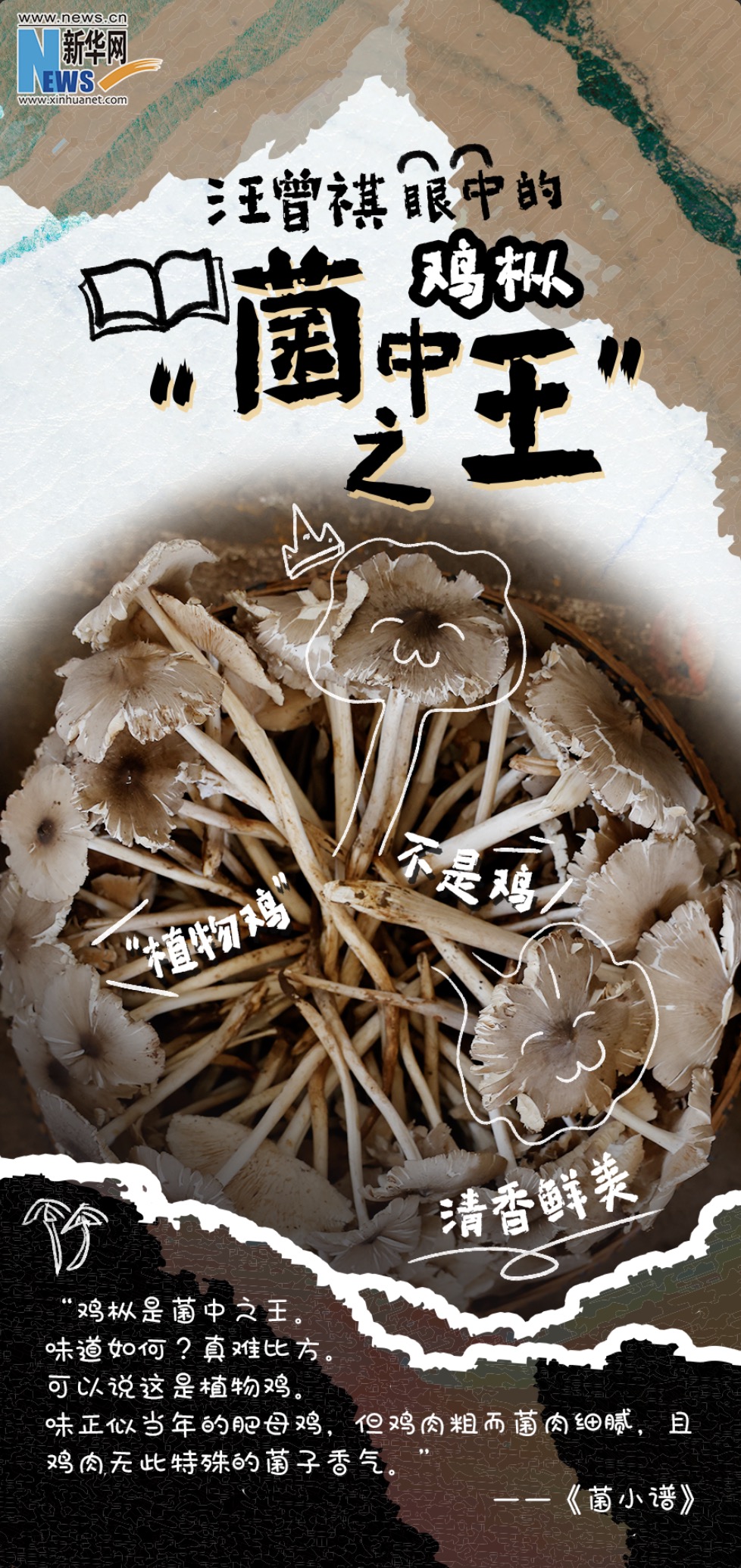 鸡枞是当之无愧的菌中之王,味道鲜浓,无可方比。在《昆明的吃食》一文中,汪曾祺记录下了许多他钟爱的美食。谈及鸡枞,他说:“鸡枞有一股清香,入口无渣,甚滑。”在品尝鸡枞后,更是用“腴”一字概括鸡枞的鲜美口感。