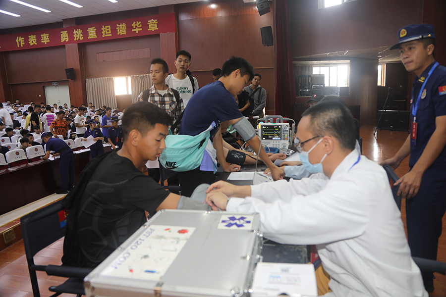 为应对测试考核工作中的各种情况,考务组聘请专业医生在考前对考生进行心率血压等数据检测。同时,针对今年报考女消防员的新情况,专门设置男女候考区,为候考考生提供便利。