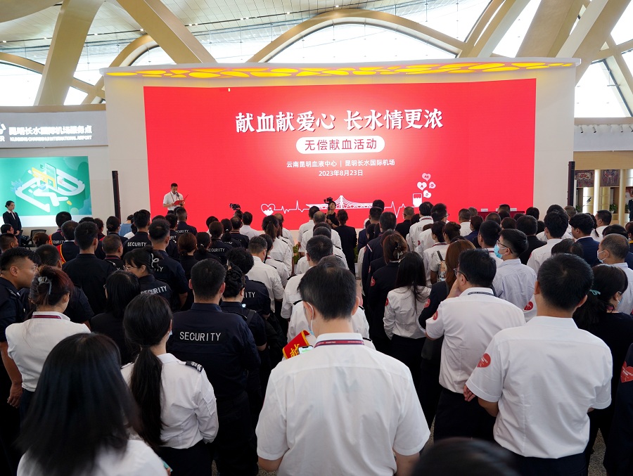 在昆明长水国际机场组织和动员安排下,航站楼内还设置了无偿献血的公益宣传点,65名机场团员青年身披绶带作为流动志愿者穿梭在旅客人群中,发放无偿献血宣传册和倡议书,号召过往旅客加入无偿献血队伍。