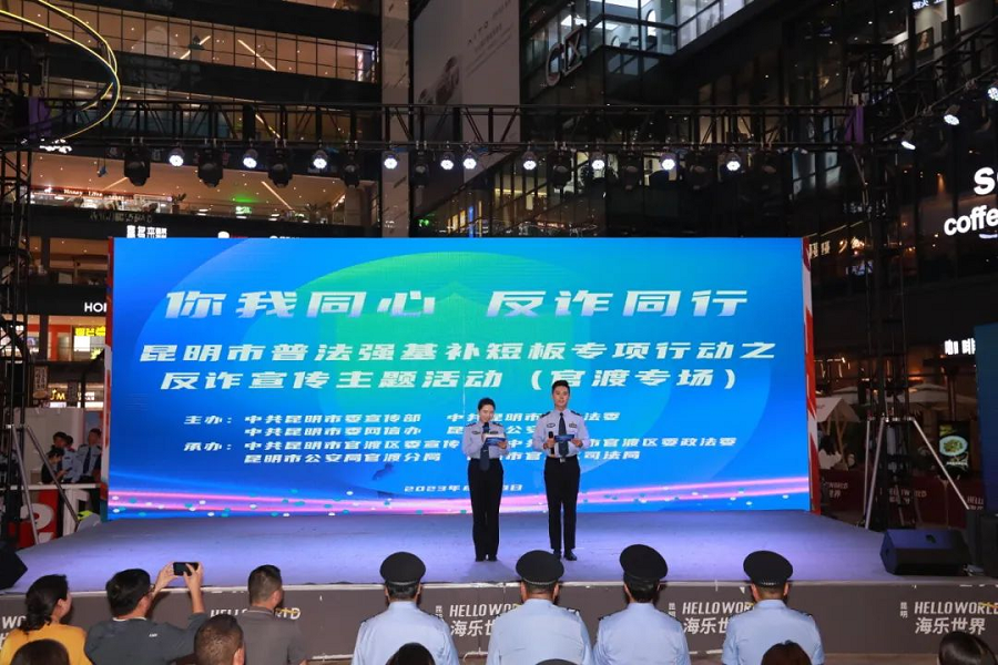 日前,昆明市普法强基补短板专项行动之反诈宣传主题活动(官渡专场)在昆明海乐世界举行。活动旨在全面加强昆明市社会面治安管控,有效防范治理夏季治安违法犯罪问题,全力遏制电信网络诈骗违法犯罪的高发势头,持续净化社会治安环境。
