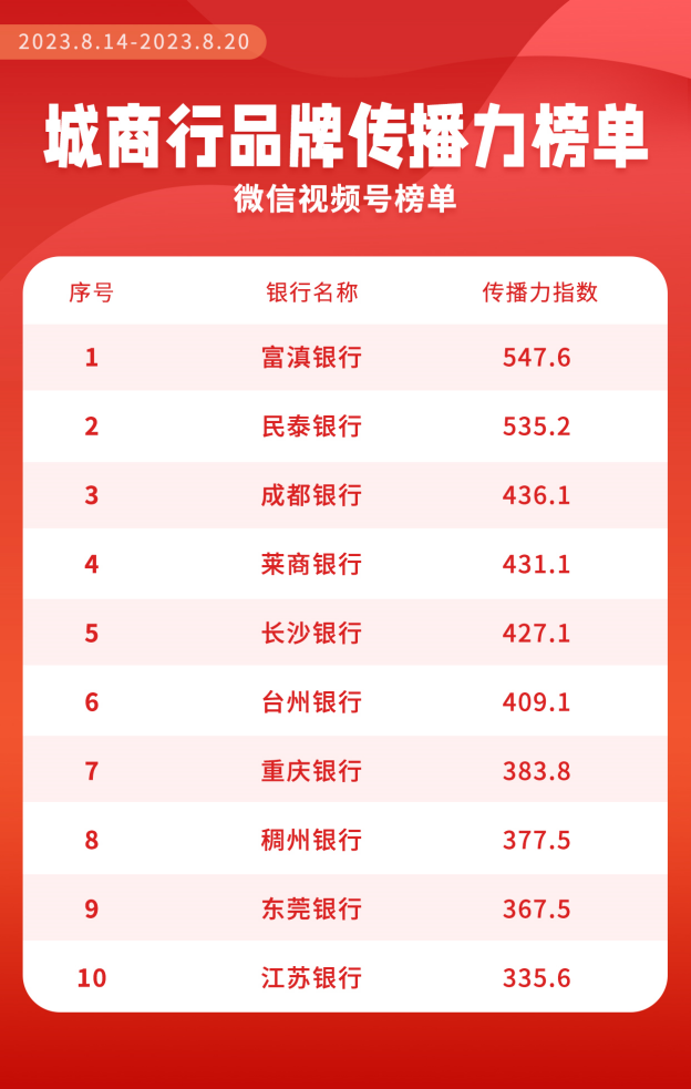 榜单基于搜集整理城商行微信视频号运营数据,通过评价综合影响力,从新媒体内容运营的角度,分析城商行传播力指数。从内容看,富滇银行凭视频作品收获传播力指数547.6,位居榜首。(完)