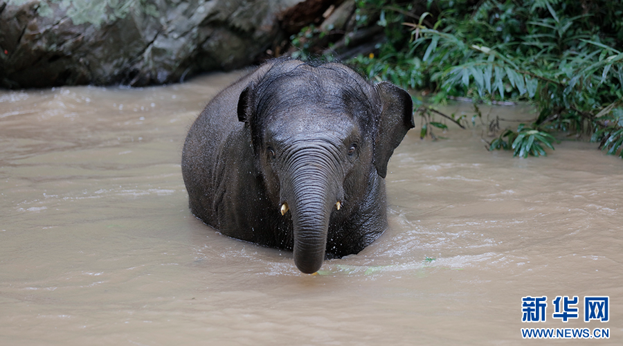 小象“龙龙”在溪水里玩耍(7月16日摄)。新华网发(徐华陵 摄)
