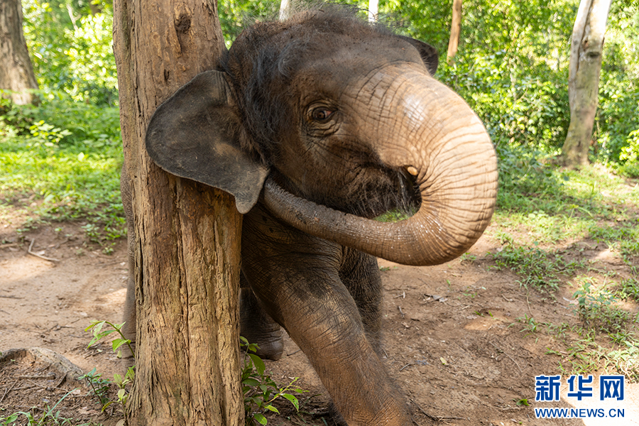 小象“龙龙”挠痒痒的方式之一就是蹭树(7月16日摄)。新华网发(刘云 摄)