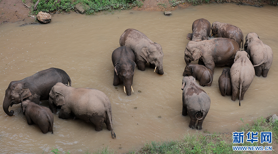 野象家族出没,远看并不容易发现它们身上的毛发(7月14日摄)。新华网发(徐华陵 摄)