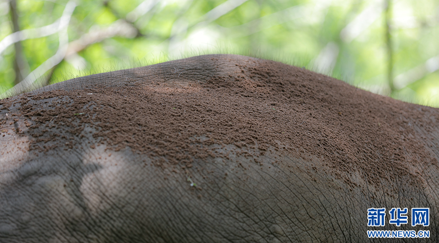 特写视角下,亚洲象的身上有许多细小的毛发在保护它们的身体(7月17日摄)。新华网发(徐华陵 摄)
