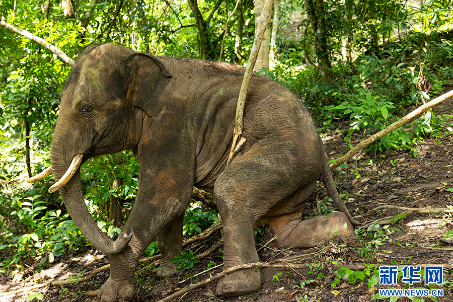 在野外玩耍时,救助象“小强”很喜欢拉扯藤蔓(7月16日摄)。新华网发(刘云 摄)