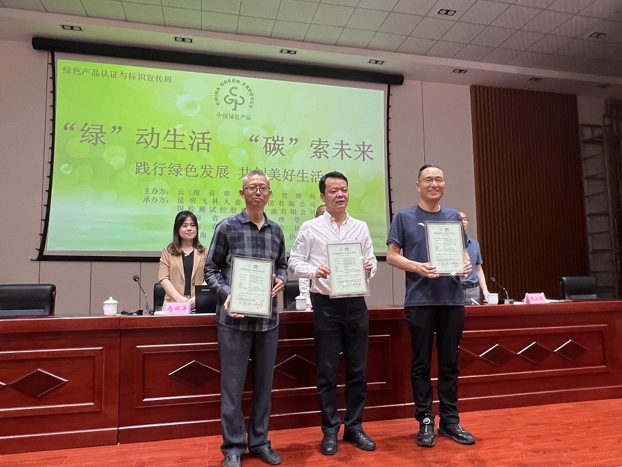 会上,参训代表为获得绿色产品认证的部分企业颁发证书。昆明飞林人造板集团有限公司代表向参会人员分享了绿色产品认证感悟及经验。