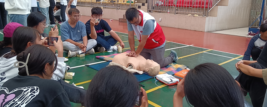 当天,培训老师分别讲解了红十字运动历史、救护概论、心肺复苏、创伤救护等理论知识。在实操环节,多名培训老师现场教授和指导学生进行心肺复苏、创伤包扎等急救技能。