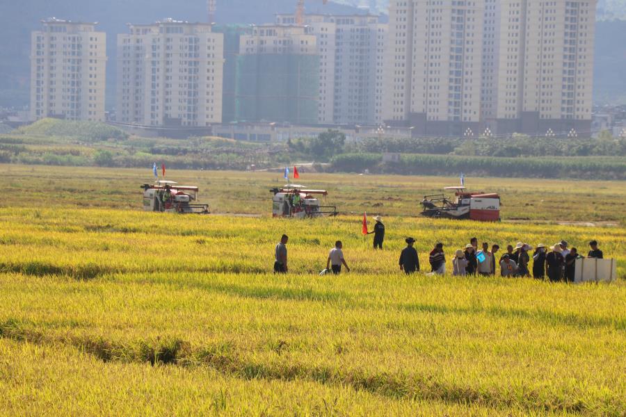 观看现代农业科技产业园水稻机械收割场景(9月23日摄)。姬明银 摄