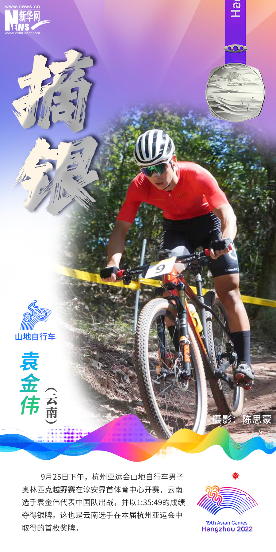 9月25日下午,杭州亚运会山地自行车男子奥林匹克越野赛在淳安界首体育中心开赛,云南选手袁金伟代表中国队出战,并以1:35:49的成绩夺得银牌。这也是云南选手在本届杭州亚运会中取得的首枚奖牌。(完)(罗春明 冯雨钐 陈寒青 丁凝 图片:陈思蒙)