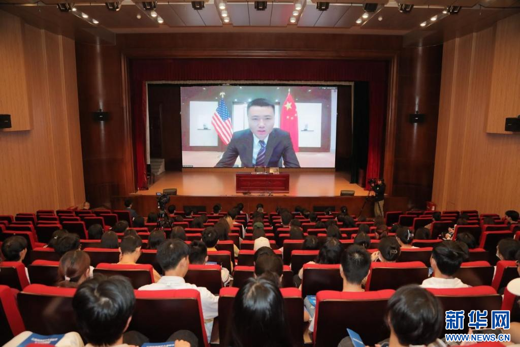 图为中国驻纽约总领事馆主管领事王程线上讲授《留学第一课 平安伴你行》