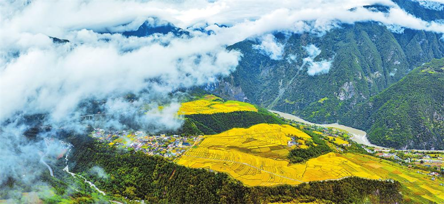 清晨,站在怒江傈僳族自治州丙中洛景区制高点极目远眺, 阳光穿透云雾倾泻而下,千亩稻田闪耀着金黄。今年中秋、国庆假期,该景区“云飘稻熟”的美景吸引着众多游客前来打卡。(通讯员 张晋康 王靖生 摄)