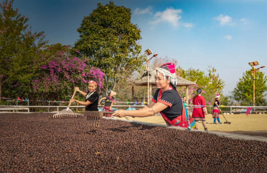 普洱市孟连傣族拉祜族佤族自治县富岩镇佤族咖农们正在翻晒咖啡豆,准备制作精品咖啡。罗恒礼 供图