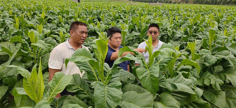 张正文(左一)到烟田查看烟株长势情况(资料图)。张洁 供图