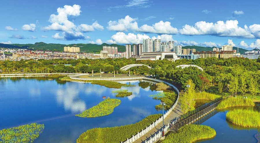 近年来,文山市以创建全国文明城市为主抓手,推动绿美文山建设,实施“城管革命”、城市更新、入城口提升改造、主题公园建设、街头景观打造等工程,高标准高质量推进城市绿化美化。图为华龙湖公园一角。 (张文峰/文 熊平祥/图)