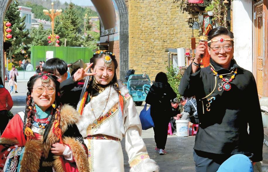 游客穿着藏族服装沿着独克宗古城石板路观光旅拍