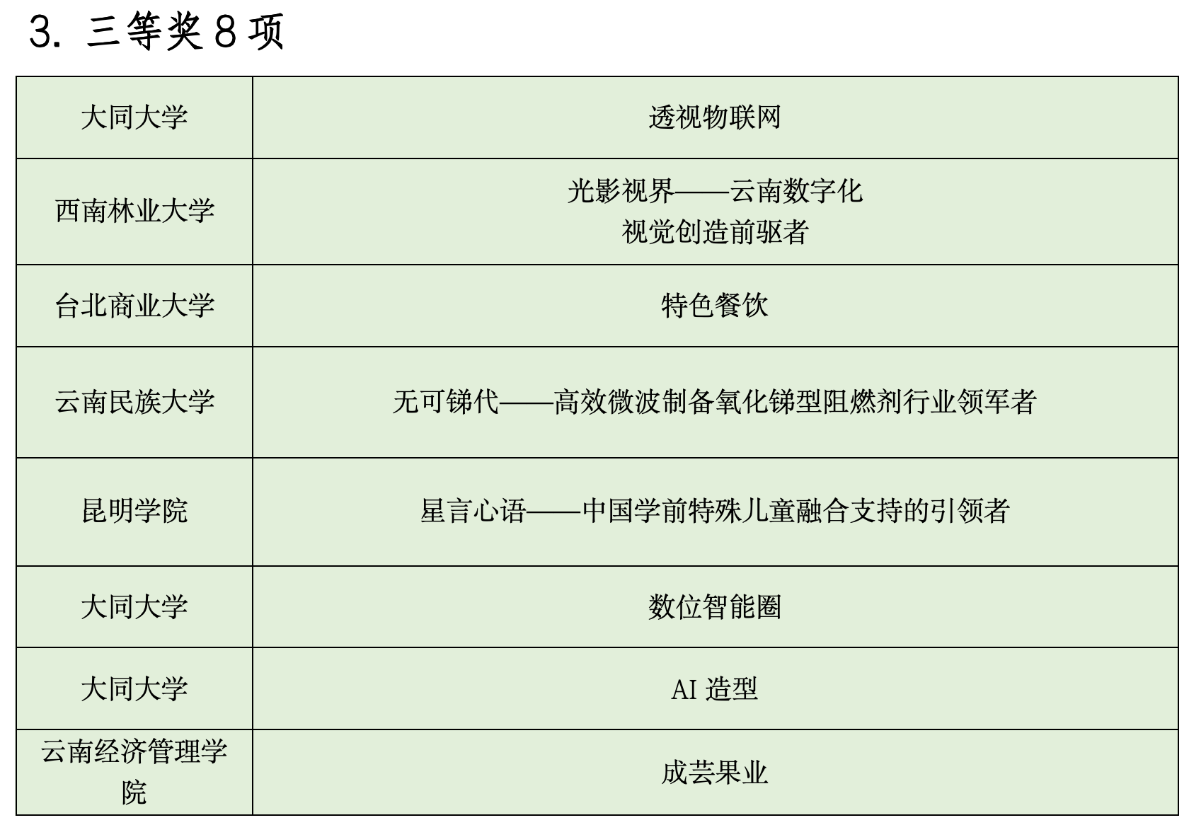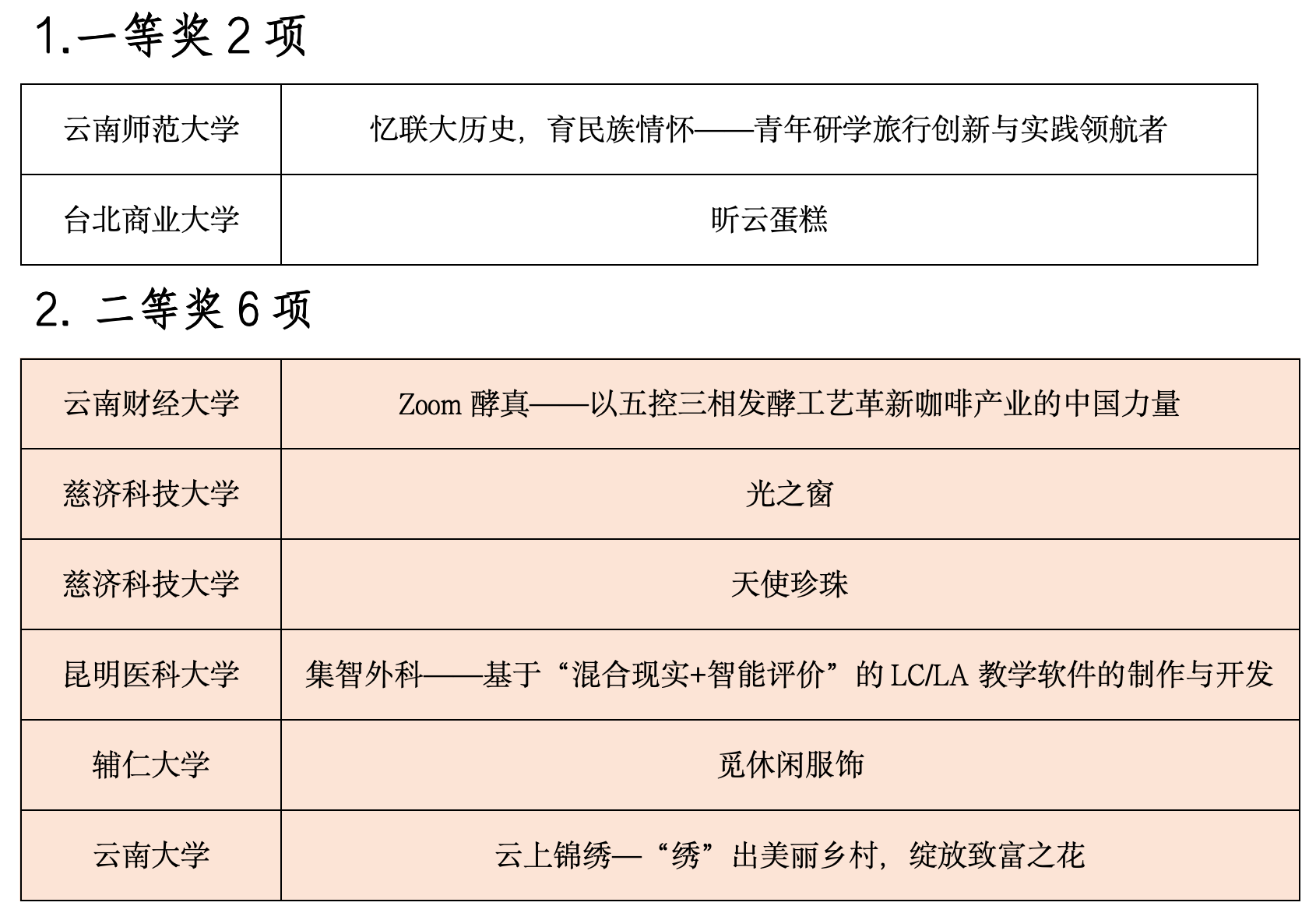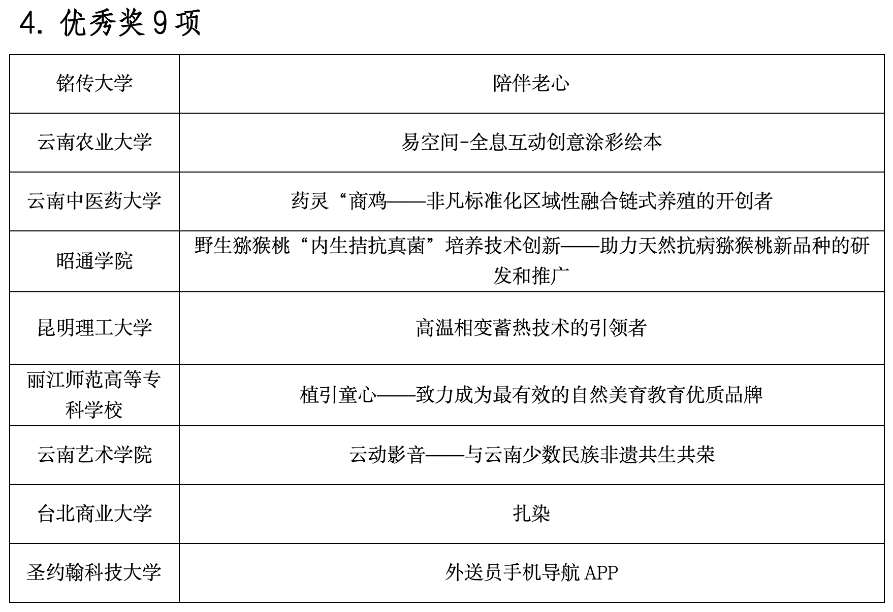 今年的邀请赛是历年来人数最多、规模最大的一次。来自云南师范大学、铭传大学、辅仁大学、云南大学、昆明理工大学、慈济科技大学等20所云台高校学生组成的25支队伍,聚焦教育、文化、信息、现代物流、高原特色现代农业、养殖业食品与消费品制造等重点领域展开激烈角逐,评选出一等奖2项、二等奖6项、三等奖8项、优秀奖9项,以及最佳人气、最佳创意、优秀组织、优秀指导教师等奖项。