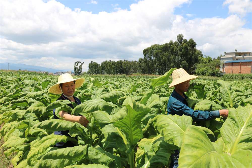 李成美和丈夫在为烤烟封顶打杈(7月24日 摄)。李志旭 摄