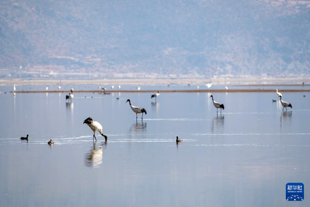 黑颈鹤和水鸟在纳帕海自然保护区栖息。