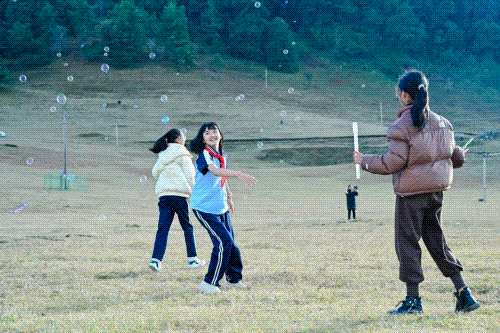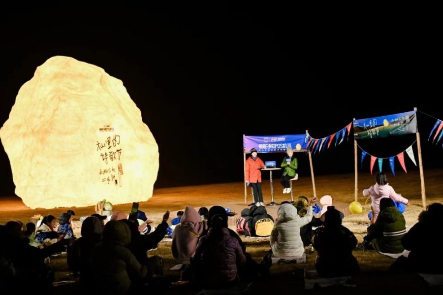 相逢自然而然。12月23日傍晚,群山绵延,在海拔2400米的天堂山草甸上,立着一块发光的“巨石”,暮色四合,巨石散发着暖暖的光芒,好像天地之间亮起的一盏阅读灯。巨石其实是一座8米高的建筑,上面刻着“大山里的诗歌节”几个大字和孩子们的诗。走进巨石之中,抬头看去,内壁上也刻满了孩子们的诗。山里的孩子像石头一样粗砺而质朴,而诗就是他们心里发出的光,写诗的孩子就是发光的石头,照亮自己,也照亮世界。举办“大山里的诗歌节”就是为了让身边的人看到山里孩子的才华,吸引更多人支持和参与诗歌教育,帮助更多的孩子发出他们心里的光。