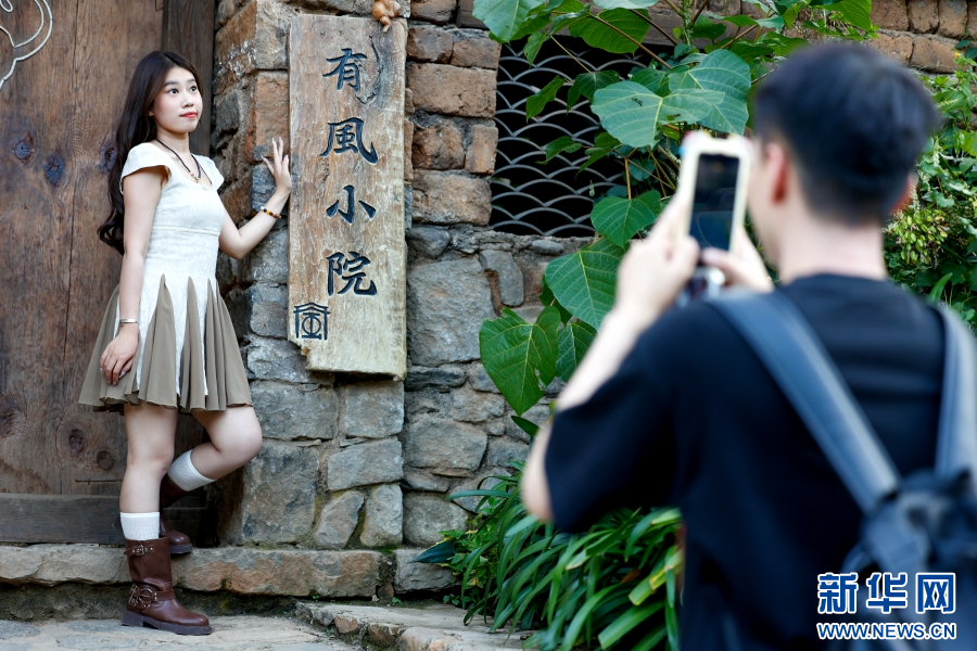 游客在大理凤阳邑有风小院门口打卡拍照(资料图)。新华网 赵普凡 摄