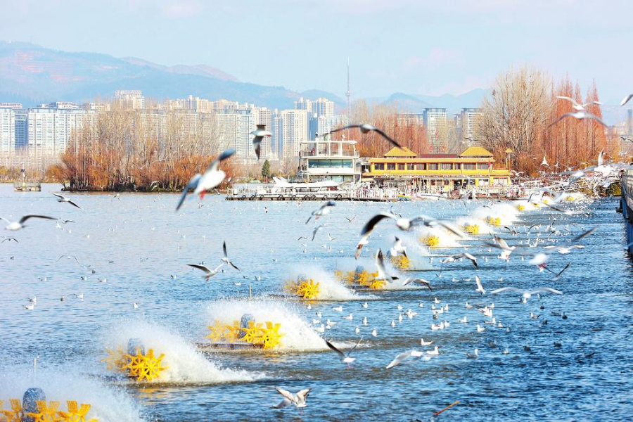 昆明滇池大坝附近红嘴鸥聚集,成为冬季游览热门地。记者 陈飞 摄