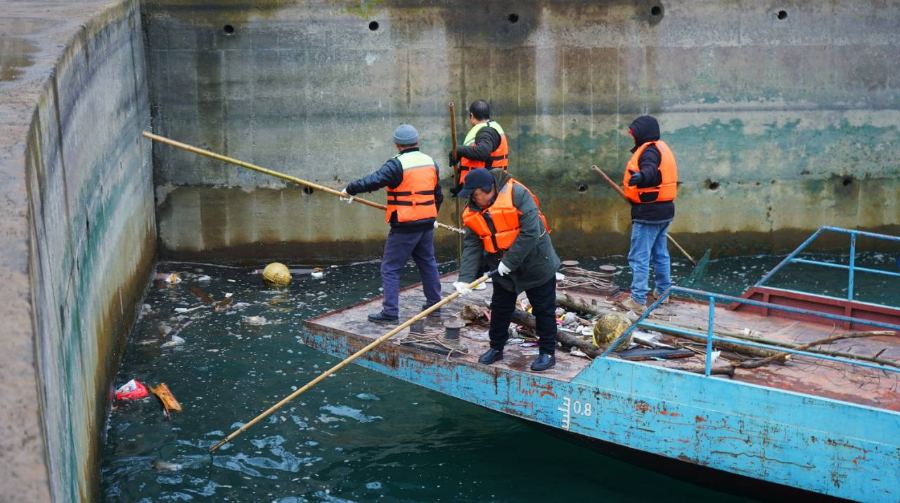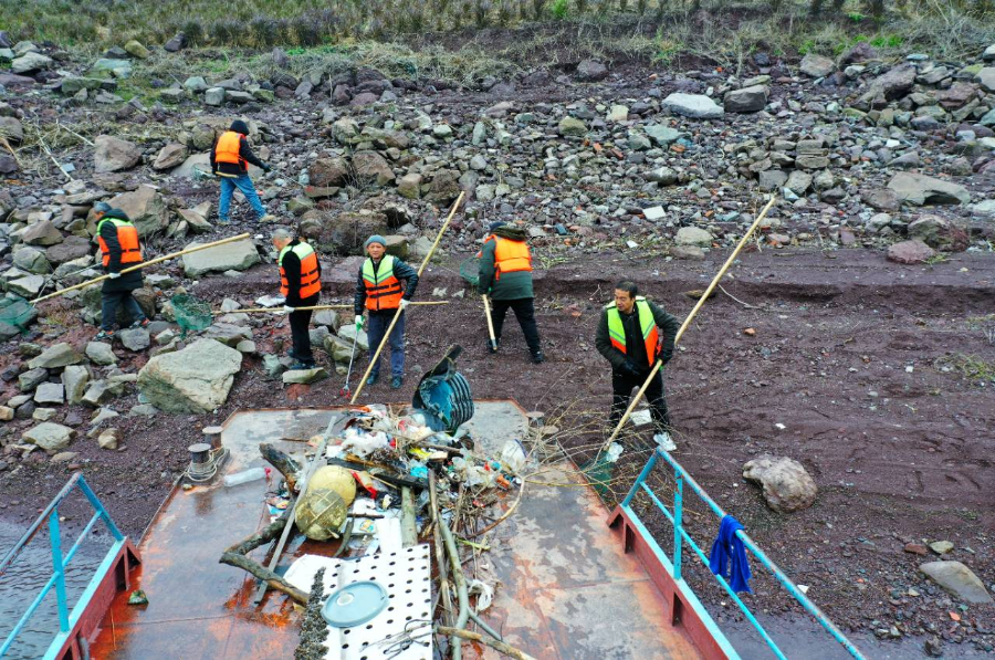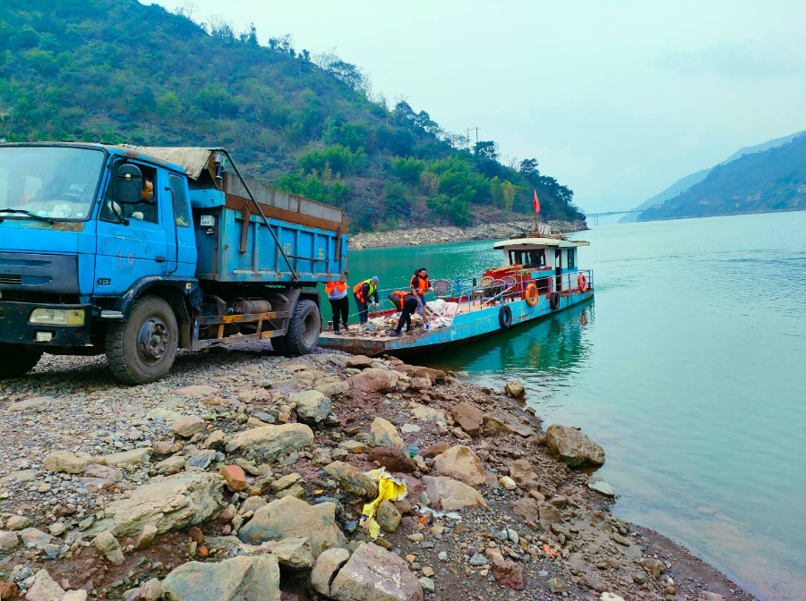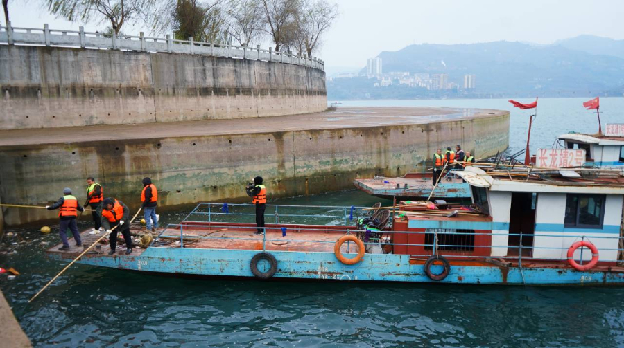 “主要是泡沫和上游山里面冲出来的树枝。”队员说,冬季没有洪水,加上每天巡查及时打捞,江面的垃圾相比夏季要少很多。在县城逗号码头附近,因为江水回流,一些枯枝和生活垃圾汇聚在江面,队员们立刻挥动捞网忙碌起来,动作娴熟而麻利,很快江面垃圾被清理一空。