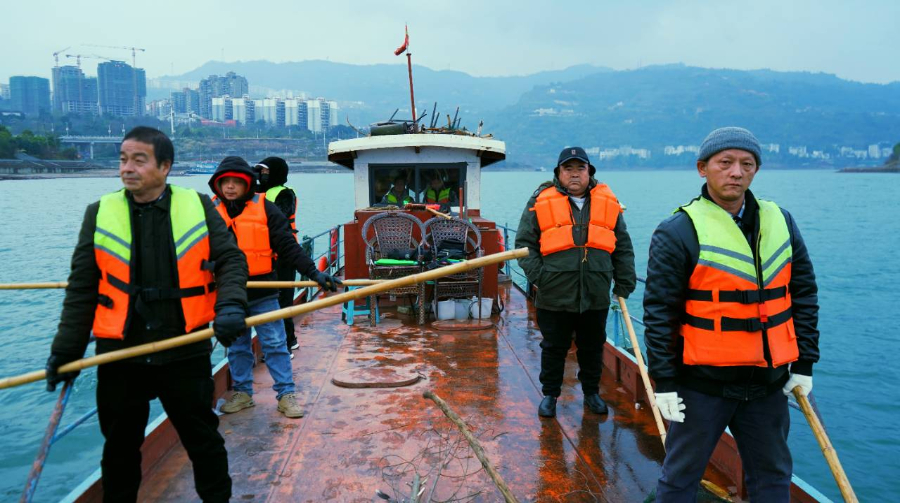 2月19日(正月初十)上午8时,绥江县库区清漂队16名队员出发,分乘两艘船离岸,开始一天的清漂作业。清漂船缓速前进,沿江巡查,船头上队员持竿而立,像是驻边的战士,所不同的是,他们所守卫的是百里长湖的一湖清波。