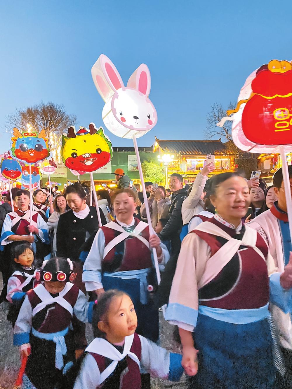 元宵节前夕,大研街道各社区组织制作花灯,并邀请社区居民和游客参与其中。元宵节当晚,大研街道锣鼓声响起,各民族群众身着民族服装,提着精心制作、形态各异的花灯从玉河广场出发,7支社区群众组成的队伍分别去往不同的街巷,所到之处皆是欢声笑语。不少游客也加入到夜游的队伍中来,有的拿起相机记录下这美好的时刻。在浓郁的节日氛围中,大家共同感受着丽江古城的流光溢彩之美。(记者 殷洁 侯婷婷 郑千山 张雯 胡梅君 饶勇 浦美玲 王璐瑶 沈迅 谢蕊灿 段晓宇 秦蒙琳 段苏航 李丽 黄翘楚 李兴文 娄莹 杨艳鹏 黄立康 和茜 李春林 见习记者 高玥 李彤 隋鑫 通讯员 李丽 陈耀邦 建融 彭雷 杨毅 黄大鹏 路止兴/文 记者 陈飞 沈迅 见习记者 高吴双 通讯员 李立军/图)