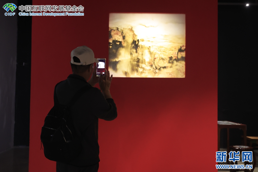 大理石方志馆里,一名游客正在观赏大理石画(摄于4月3日)。(新华网 赵普凡 摄)