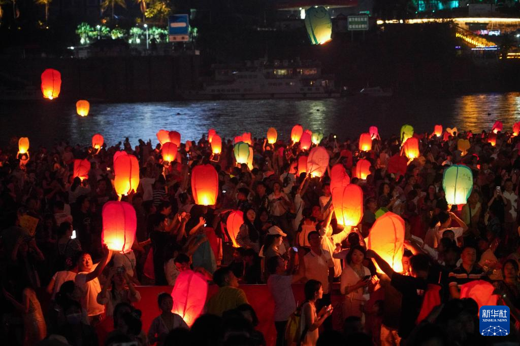 4月13日晚,人们在云南省景洪市澜沧江边放飞孔明灯。新华社记者 王静颐 摄