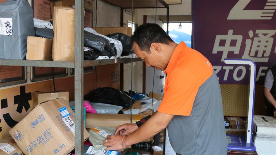 中通工作人员为快递包裹粘贴宣传贴纸(4月9日摄)。王垚 摄