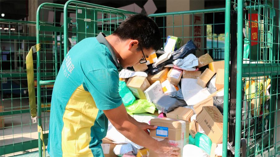 邮政工作人员为快递包裹粘贴宣传贴纸(4月9日摄)。王垚 摄