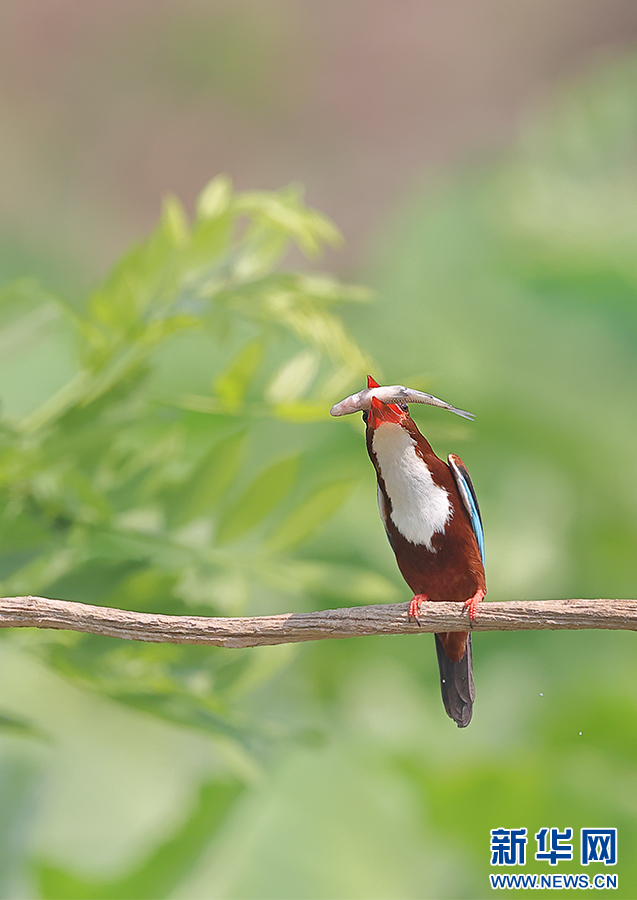 白胸翡翠玩耍小鱼后吞食(4月15日摄)。新华网发(杨学飞 摄)