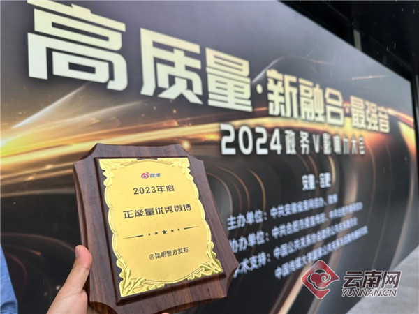 4月19日新浪微博“高质量·新融合·最强音——2024政务V影响力大会”在安徽合肥召开,“昆明警方发布”微博号获得“2023年度·正能量优秀微博”奖项。