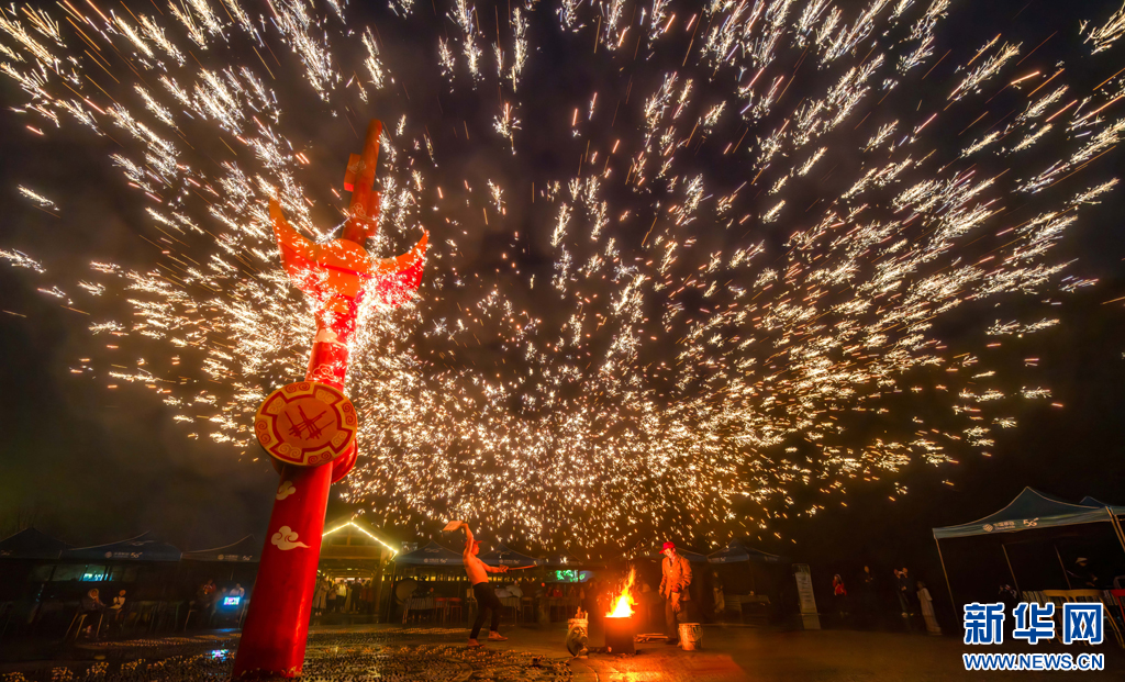 游客正在观看非遗“打铁花”民俗表演(5月2日摄)。新华网发(曾三东 摄)