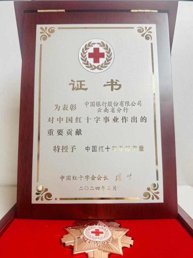 在云南省红十字会建立110周年之际,中国银行股份有限公司云南省分行(以下简称“中国银行云南省分行”)受邀出席云南省“5·8”人道公益日互联网筹款活动启动仪式及座谈会,并被中国红十字会授予“中国红十字奉献奖章”和证书。