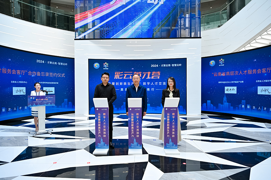 活动中,云南省首个高层次人才服务会客厅在盘龙区云上数字赋能产业园揭牌,云南省人才服务中心、盘龙区委人才办、云上数字赋能产业园三方共同签署“云南省高层次人才服务会客厅”合作备忘录。此次会客厅的成立将为高层次人才搭建交流互动、信息共享、成果互通、智慧碰撞、情感互通的服务平台,也是云南省在高层次人才服务方面的创新举措。