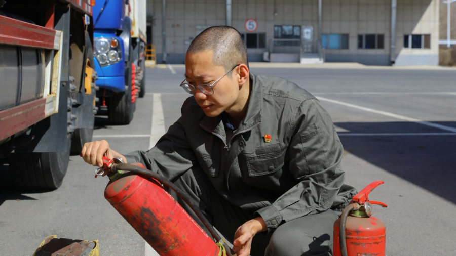 高昆鹏正在检查外来车辆灭火器(资料图)。供图
