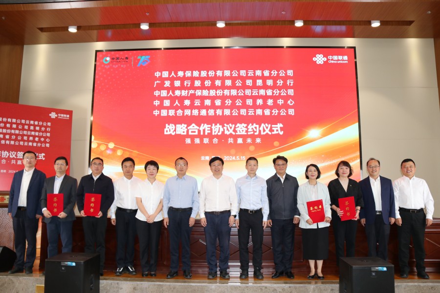 15日,中国人寿驻滇单位(中国人寿保险股份有限公司云南省分公司、广发银行股份有限公司昆明分行、中国人寿财产保险股份有限公司云南省分公司、中国人寿养老保险股份有限公司云南省中心)与中国联合网络通信有限公司云南省分公司在昆明签订战略合作协议。