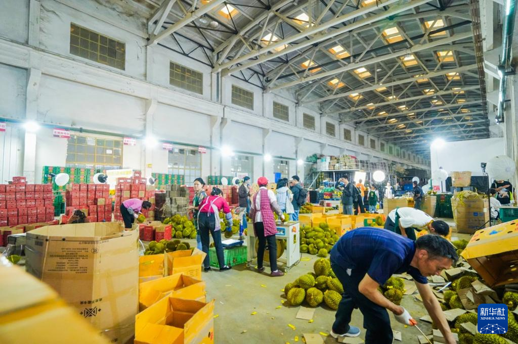 在云南思珺儿贸易有限公司助农基地里,一筐筐新鲜榴莲、山竹散发出浓浓果香,工作人员直播、打包、运输新鲜水果,一派繁忙的景象。
