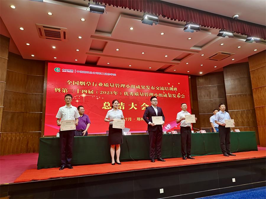 QC小组成员在全国烟草行业第三十四届优秀质量管理小组成果发布会上接受表彰(左一)(7月20日摄)。者开明 摄