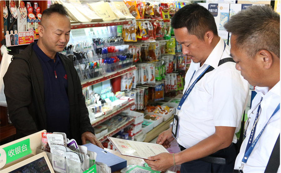 执法人员对中小学周边“红线外”卷烟经营户进行检查并宣传政策(4月8日摄)。王垚 摄