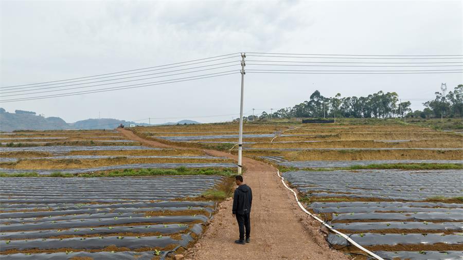 李金云在烟田查看烟苗(5月9日摄)。杨荣辉 摄