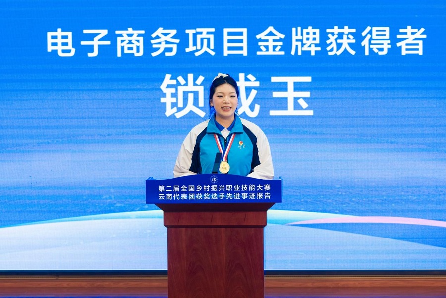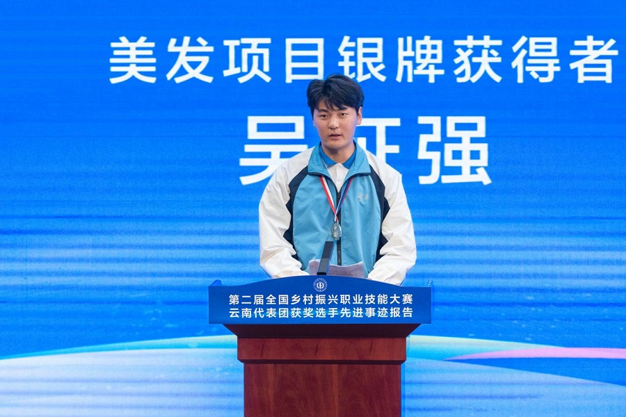 在报告会上,云南技师学院(云南工贸职业技术学院)第二届全国乡村振兴职业技能大赛电子商务项目(学生组)金牌选手锁成玉、电子商务项目(职工组)银牌选手叶枝雯、美发项目(学生组)银牌选手吴征强结合自身经历进行分享,3位获奖选手讲述了他们在训练中刻苦钻研、精益求精,在赛场上顽强拼搏、勇夺奖牌的经历,报告会气氛热烈。云南技师学院(云南工贸职业技术学院)党委副书记、院长张泽斌在致辞中表示,学校将以此次大赛取得的硕果为契机,牢牢把握机遇,进一步解放思想,守正创新,营造“一技在手,一生无忧”的氛围,激励广大青年学生走技能成才、技能报国之路。