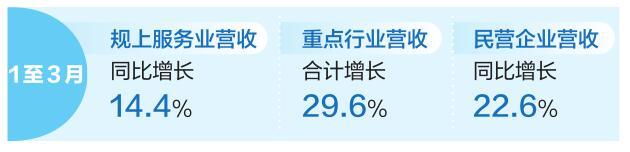 营业收入持续高速增长。1至3月,全省规模以上服务业营业收入同比增长14.4%,比1至2月加快0.4个百分点。在互联网、软件行业加速增长以及租赁和商务服务、科学研究和技术服务等支柱行业的稳定支撑下,全省重点行业营业收入合计增长29.6%,快于全国18.2个百分点。